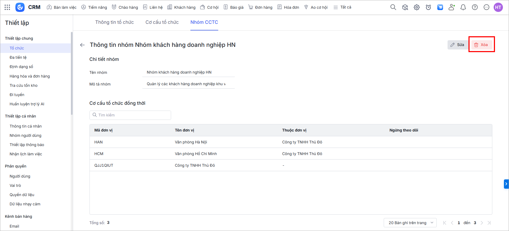 • Có thể vào chi tiết nhóm CCTC, nhấn Xóa.
