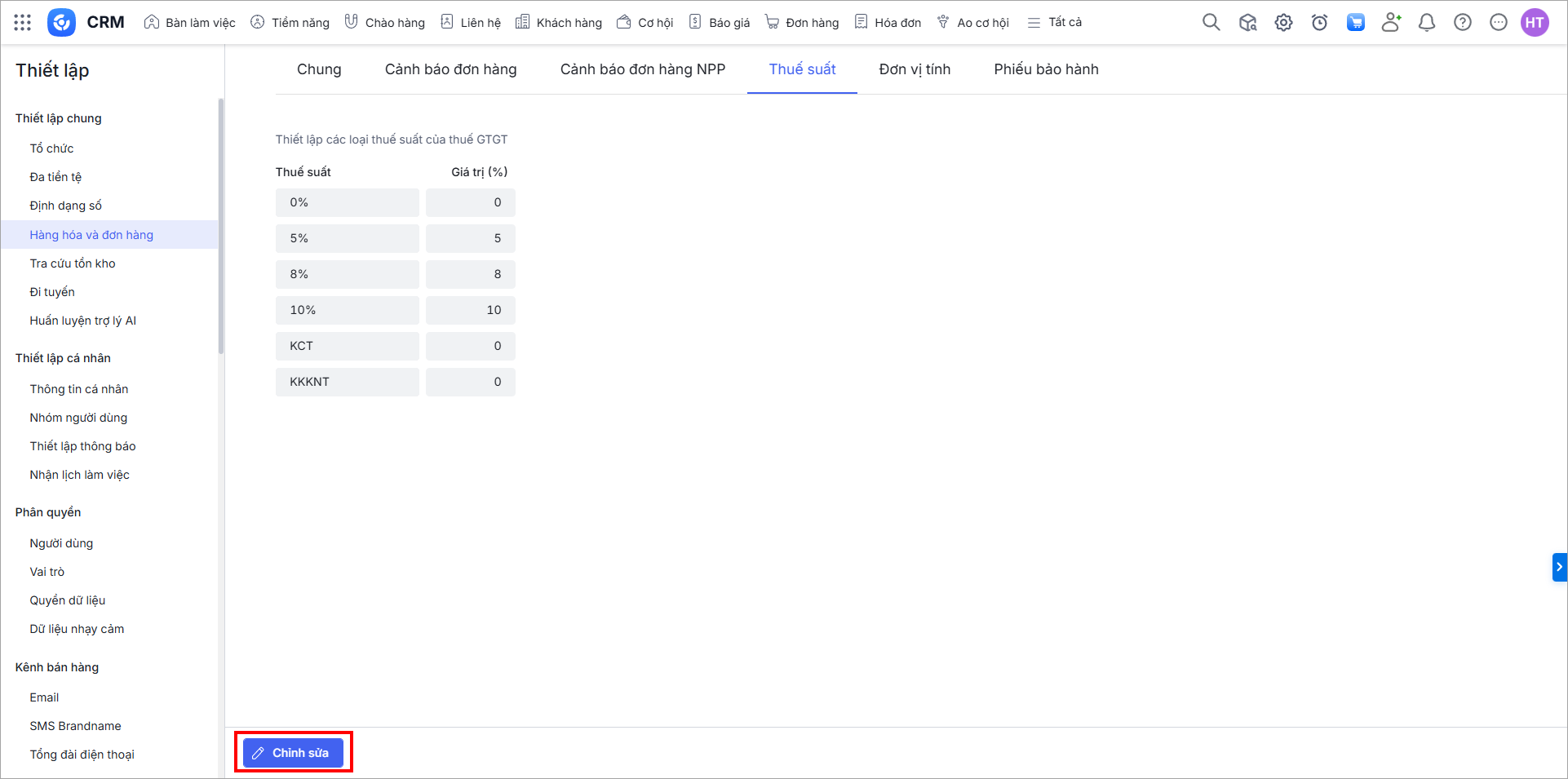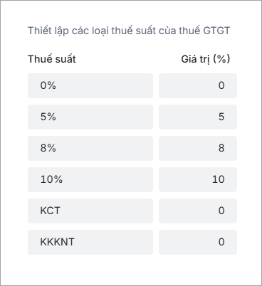 Phần mềm đáp ứng sẵn các mức thuế GTGT bao gồm: 0%, 5%, 8%, 10%, KCT (Không chịu thuế GTGT), KKKNT (Không kê khai, tính nộp thuế GTGT) -> Các giá trị thuế này là mặc định không sửa được.