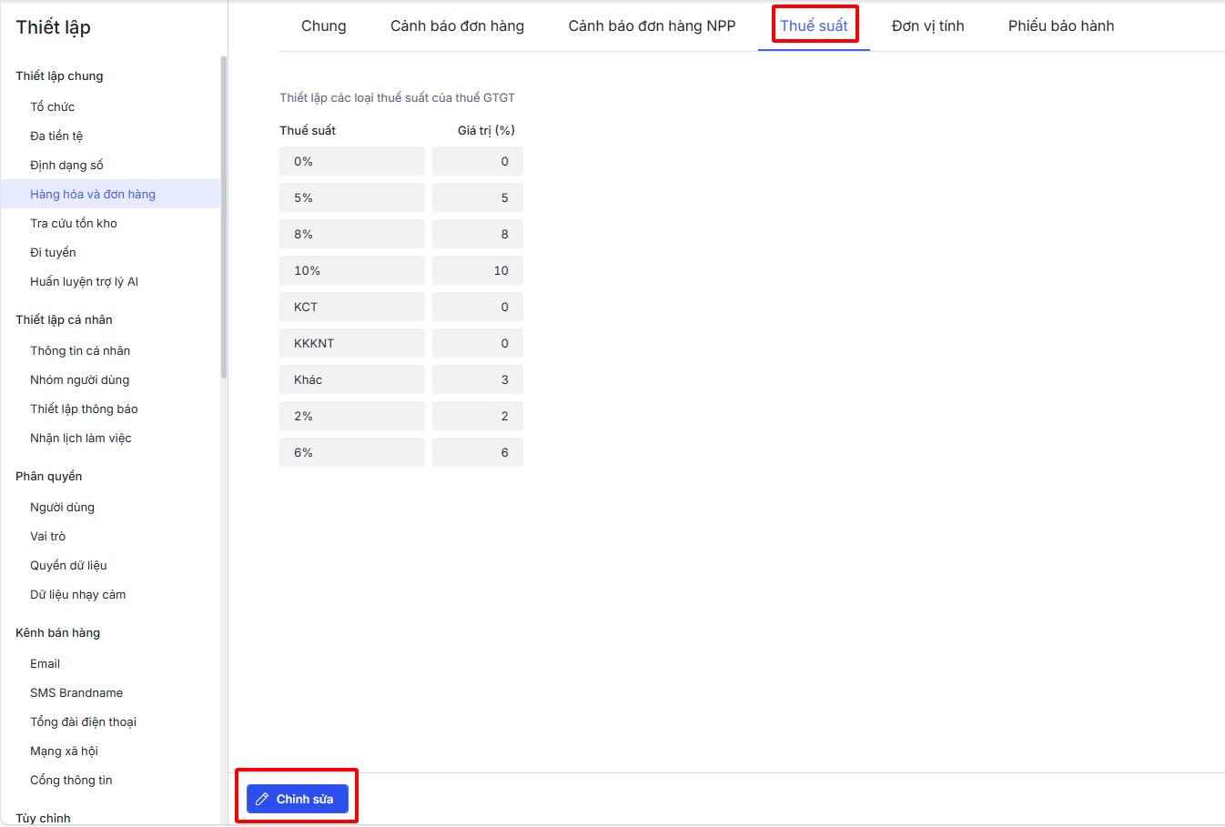 Bước 2: Ở tab Thuế suất, nhấn Chỉnh sửa để sửa thiết lập.