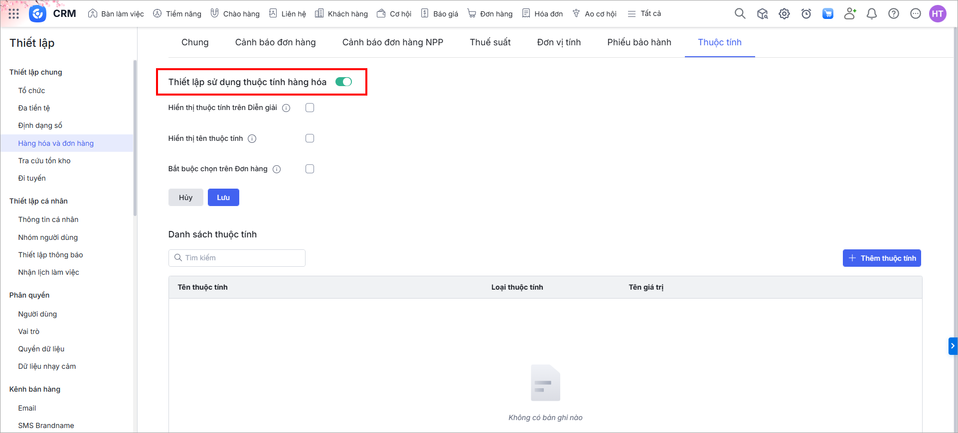 • Bật lựa chọn: Hệ thống hiển thị mục Thông tin thuộc tính trong chi tiết hàng hóa và cột Thuộc tính trong bảng thông tin hàng hóa.