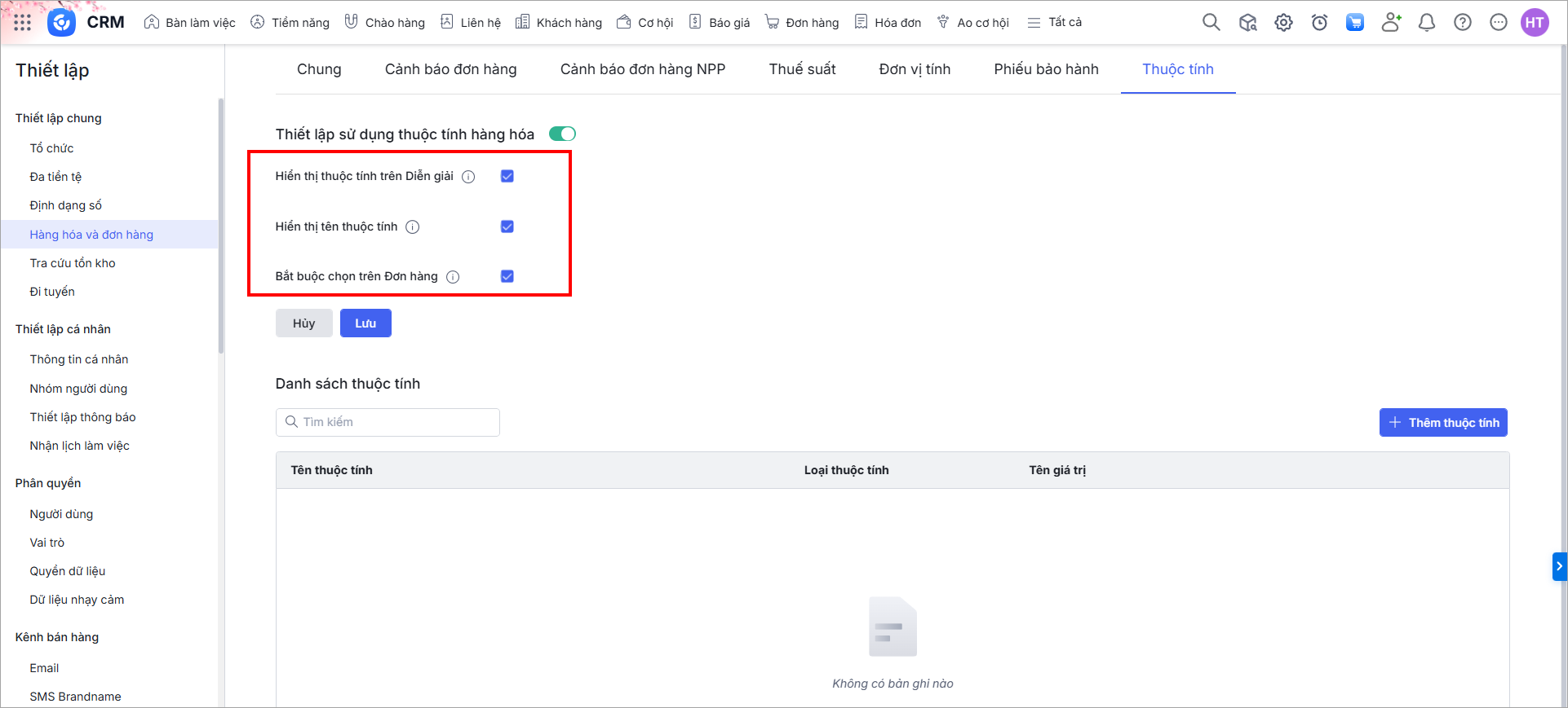 • Bắt buộc chọn trên Đơn hàng: Khi tích chọn, hệ thống yêu cầu anh/chị bắt buộc phải chọn thuộc tính trên đơn hàng đối với các hàng hóa có khai báo thuộc tính trên danh mục
