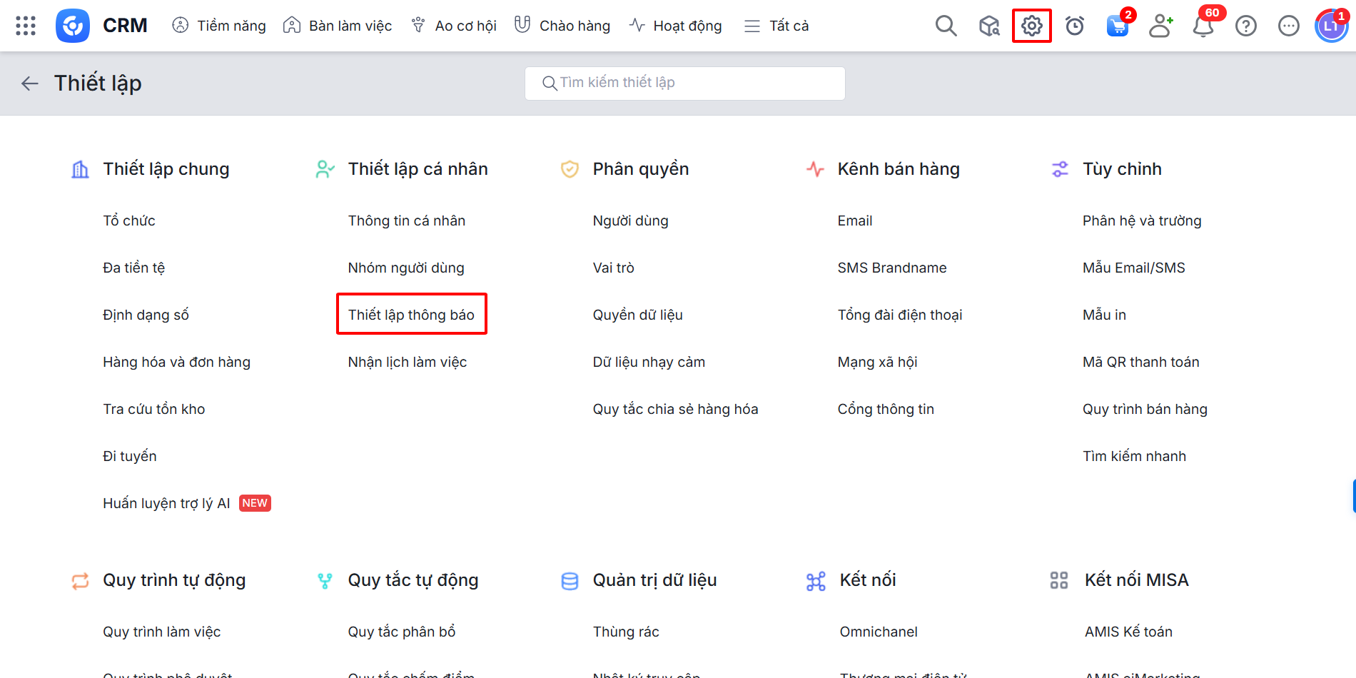 để hiển thị Thiết lập \ vào Thiết lập cá nhân \ chọn Thiết lập thông báo.