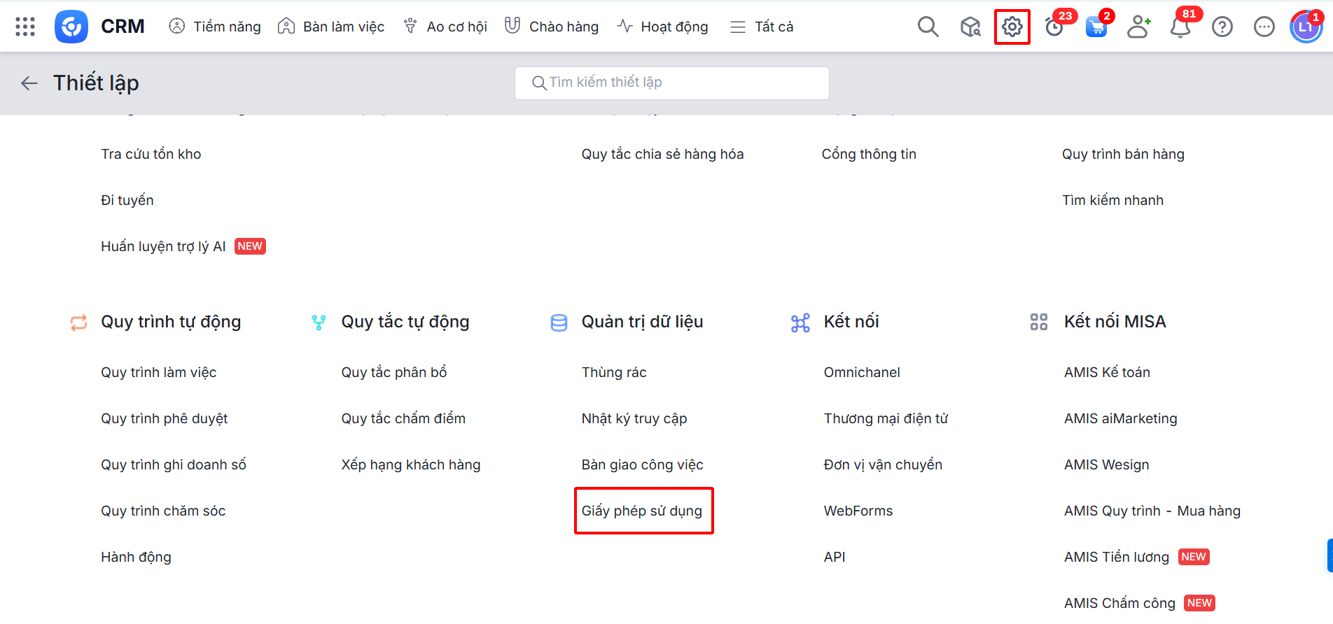 Bước 1: Trên AMIS CRM, nhấn biểu tượng bánh răng