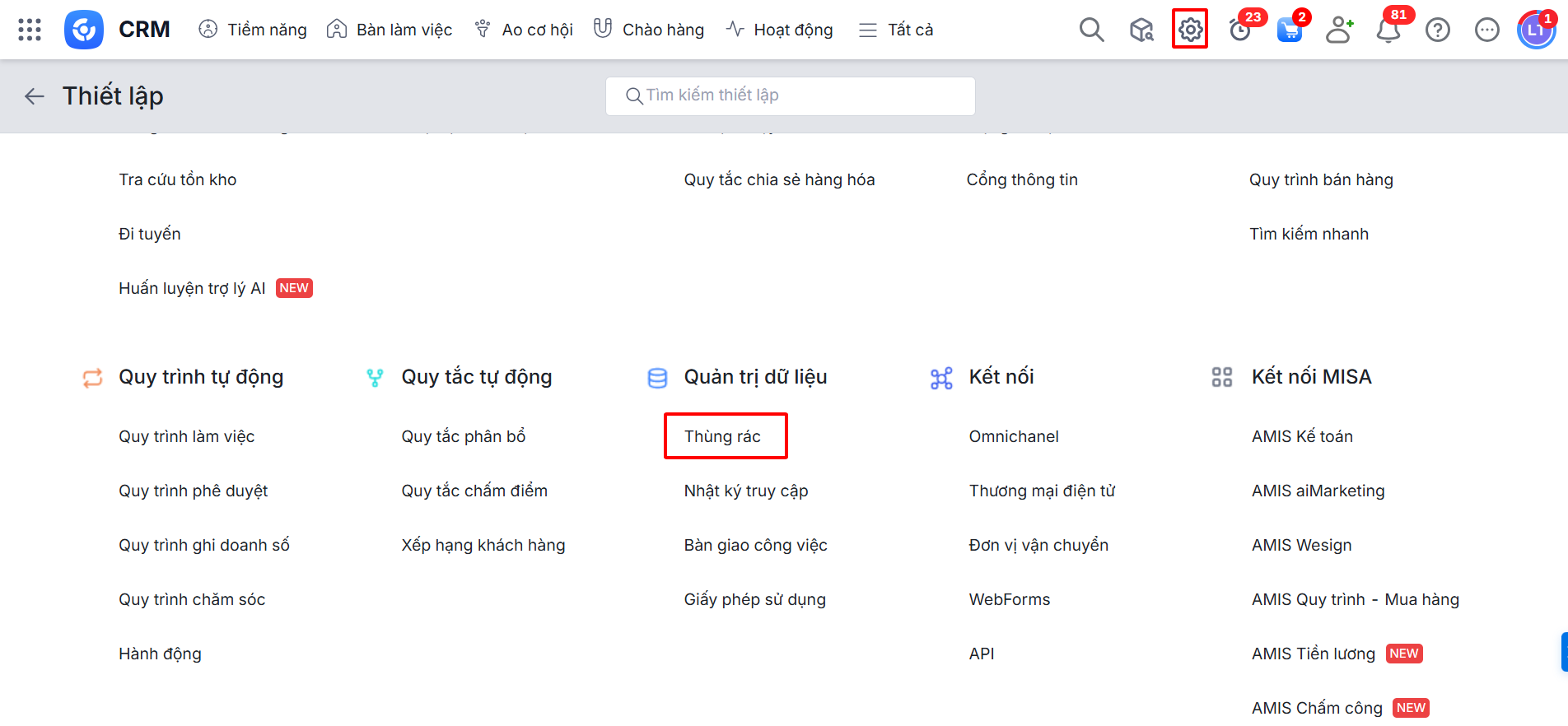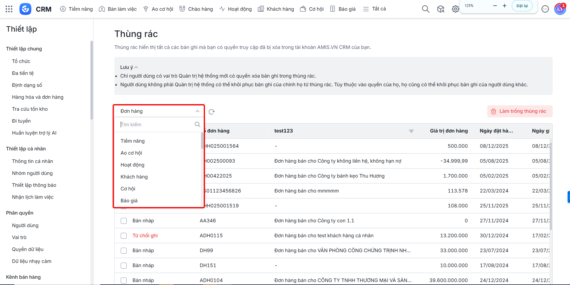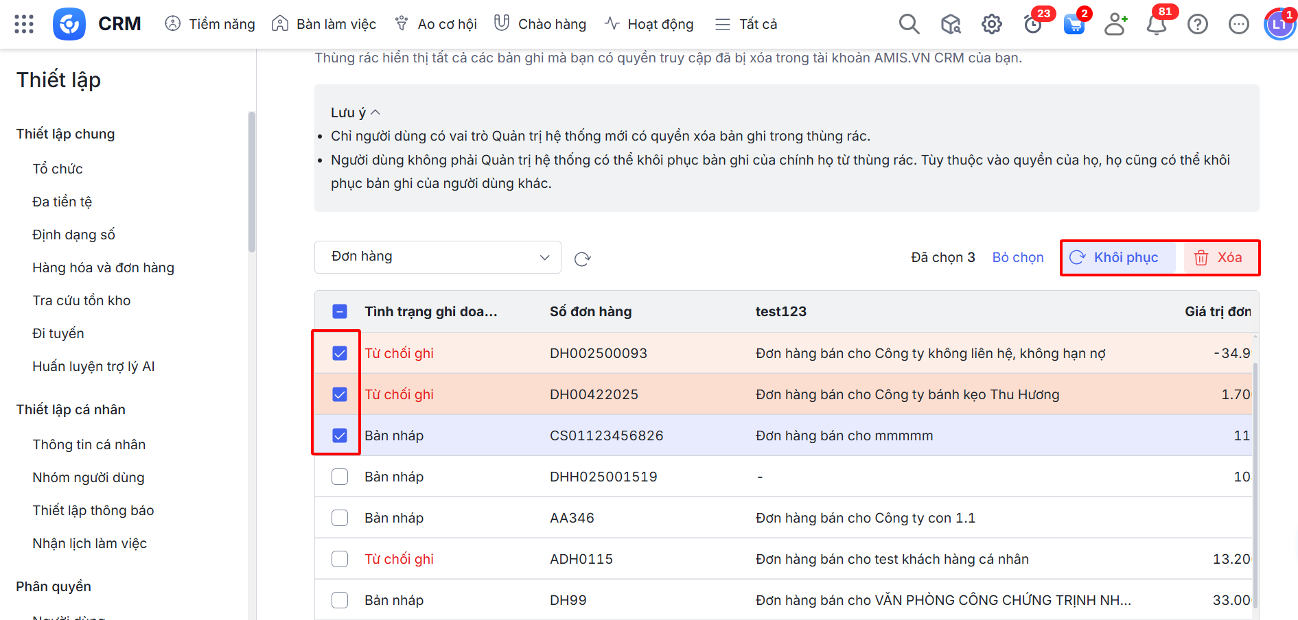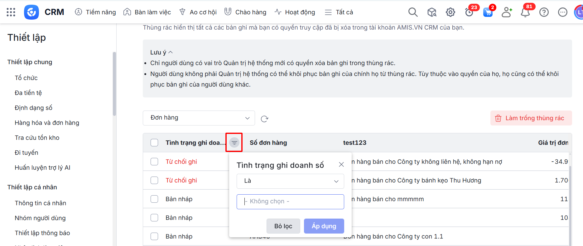 Bài viết hướng dẫn cách truy cập và quản lý các bản ghi đã xóa trong AMIS CRM thông qua tính năng Thùng rác.