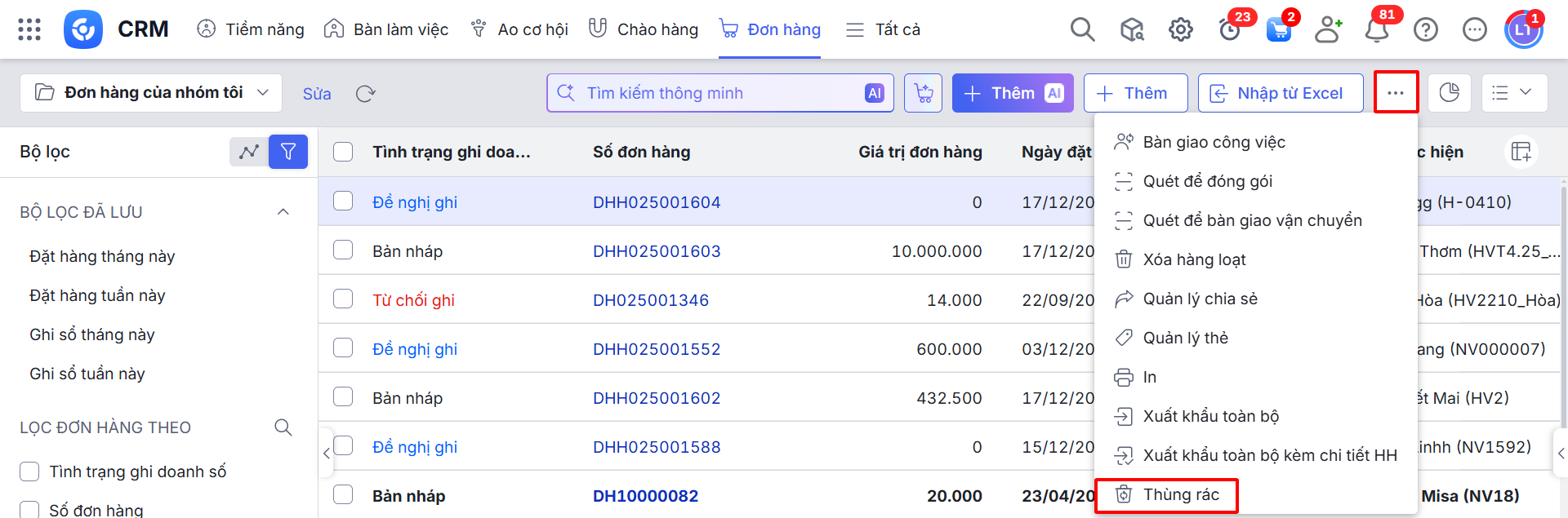 Bước 5: Ngoài ra, có thể truy cập nhanh vào Thùng rác bằng cách nhấn biểu tượng dấu ba chấm (…) tại màn hình danh sách của các phân hệ và chọn Thùng rác.