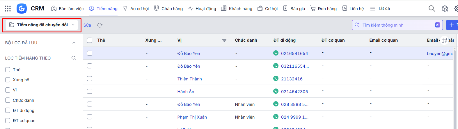 • Tiềm năng đã chuyển đổi vẫn còn tại danh sách Tiềm năng (giao diện Tiềm năng đã chuyển đổi) dù không làm gì được nhằm mục đích để kiểm tra trùng dữ liệu khi một tiềm năng mới được thêm vào hệ thống. Tránh trường hợp cùng một thông tin vừa có ở Tiềm năng, vừa có ở Liên hệ/Khách hàng.