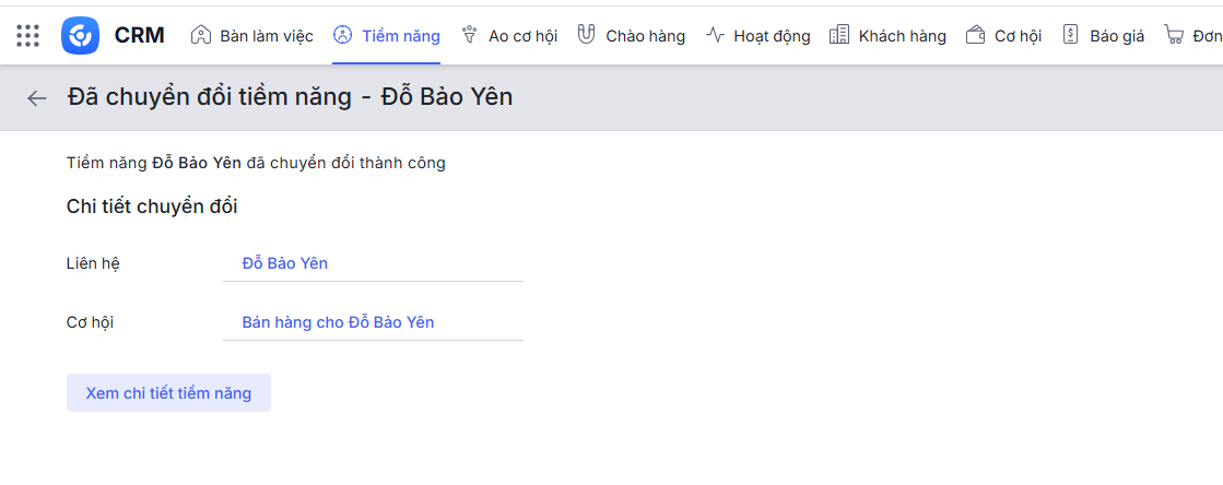 Tiềm năng khi thực hiện chuyển đổi sẽ mang toàn bộ thông tin liên quan như Ghi chú, Lịch sử nhiệm vụ, Cuộc gọi, Thẻ,… sang Khách hàng, Liên hệ, Cơ hội.