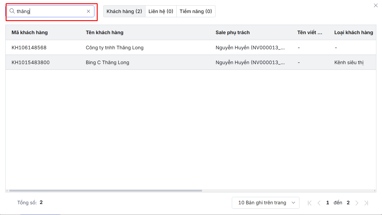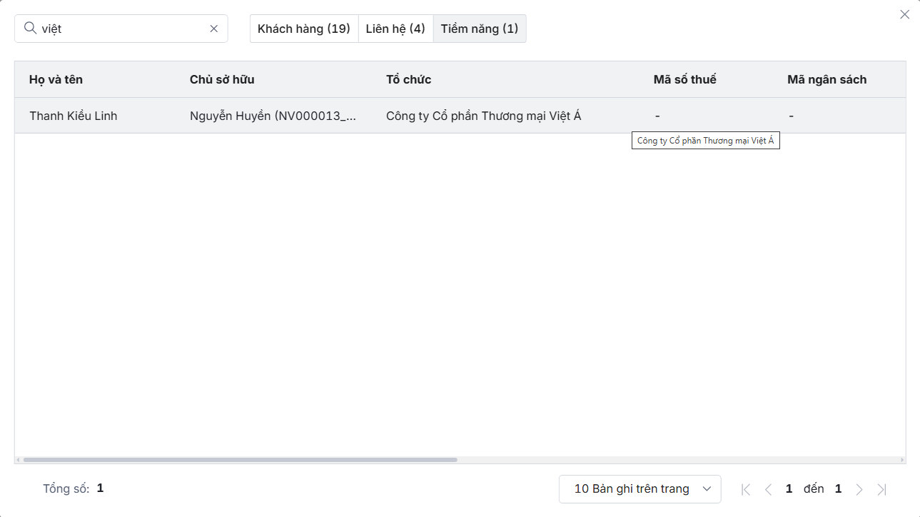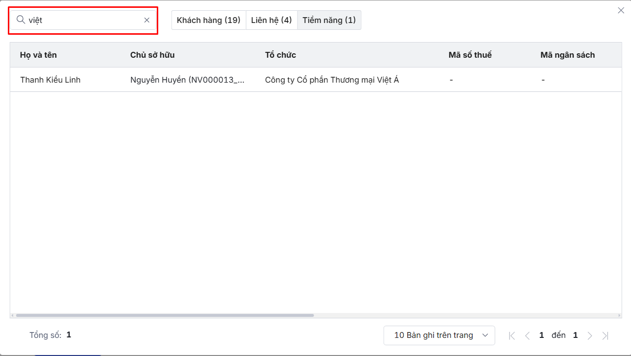 Bước 3: Tại đây hiển thị 3 mục tương ứng với 3 phân hệ Khách hàng, Liên hệ, Tiềm năng. Mỗi phân hệ sẽ có số lượng kết quả tìm kiếm được qua từ khóa tìm kiếm.