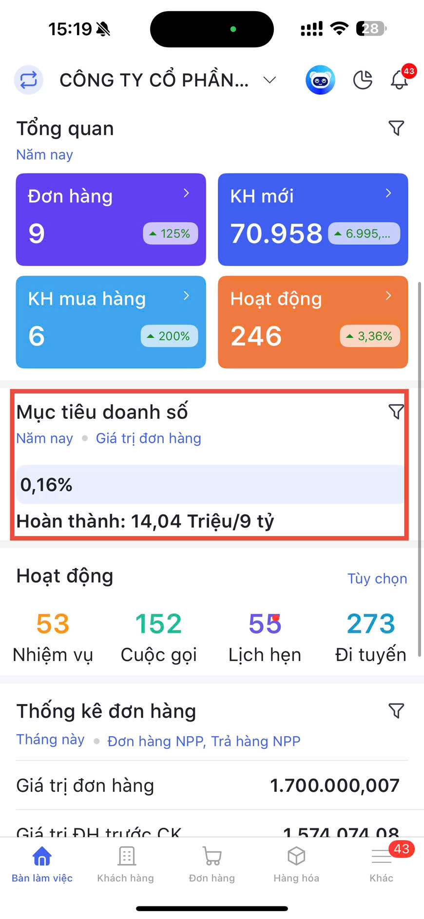 Nếu chọn xem báo cáo theo Đơn vị cấp cao nhất thì Mục tiêu = Tổng mục tiêu của các Đơn vị cấp con gần nhất của Đơn vị cấp cao nhất.