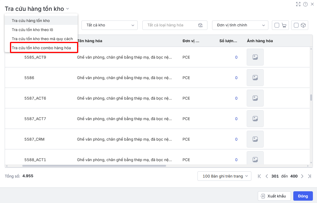 - Tra cứu hàng hóa tồn kho theo kho, lô, mã quy cách, bộ hàng hóa