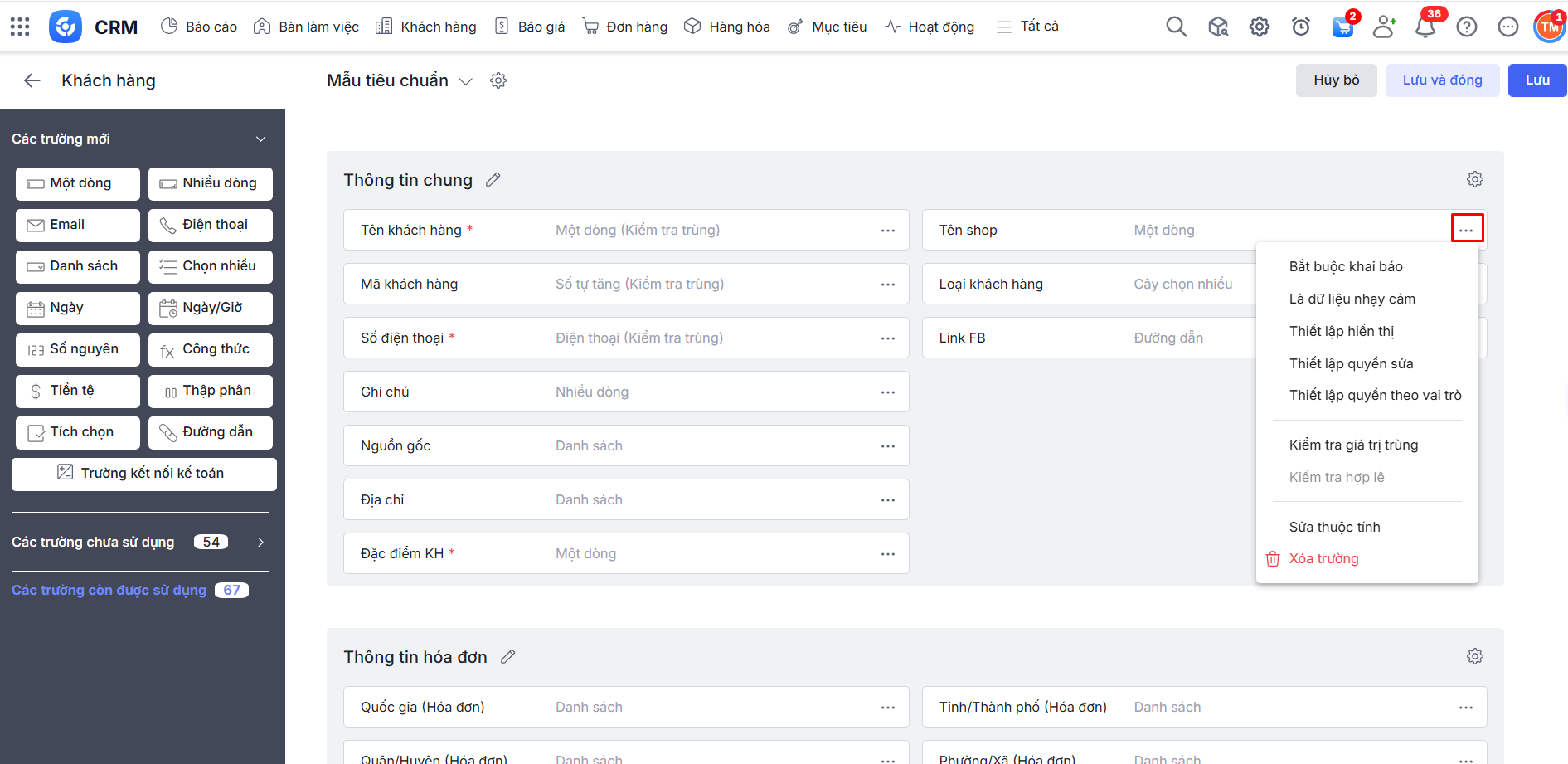 - Sửa thuộc tính: Thiết lập các thuộc tính của trường:
