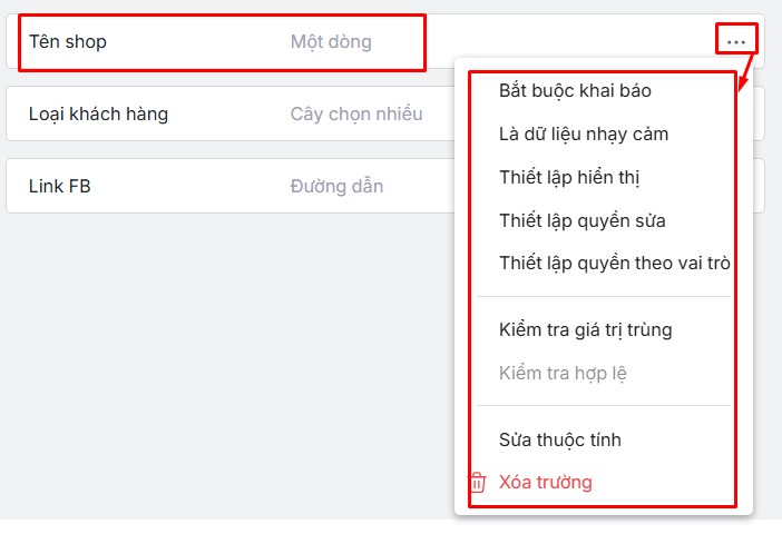 - Bắt buộc khai báo, Kiểm tra giá trị trùng, Hiển thị gợi ý tương tự trường Một dòng.