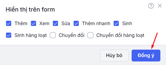 - Thiết lập hiển thị: Tích chọn các form cho phép hiển thị trường thông tin\ Nhấn Đồng ý để hoàn thành.