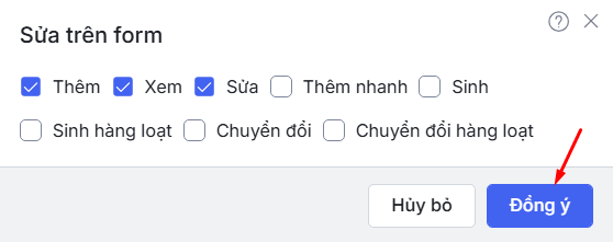 - Thiết lập quyền sửa: Tích chọn các form cho phép sửa trường thông tin\ Nhấn Đồng ý để hoàn thành.