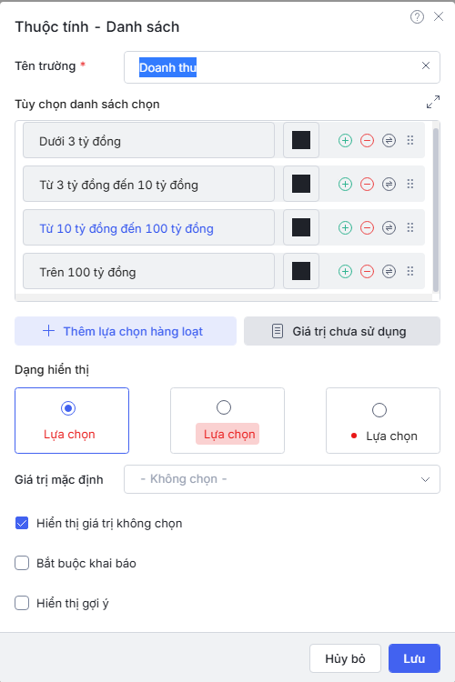 - Tùy chọn danh sách chọn: Hiển thị các giá trị để lựa chọn: