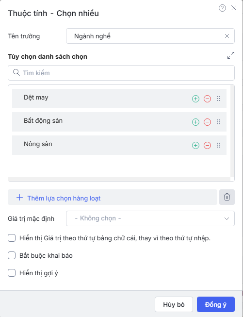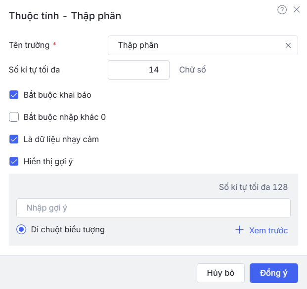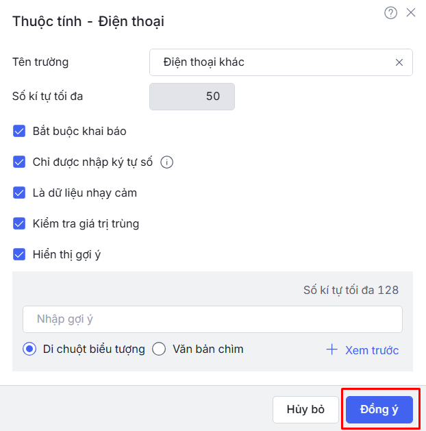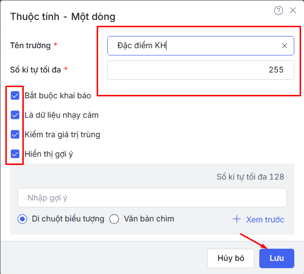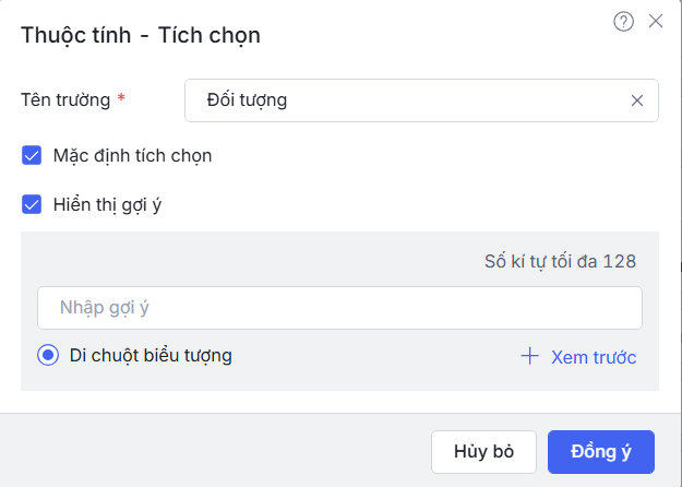 - Hiển thị gợi ý: Tích chọn để thiết lập trường thông tin có hiển thị gợi ý.