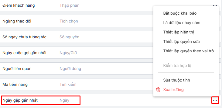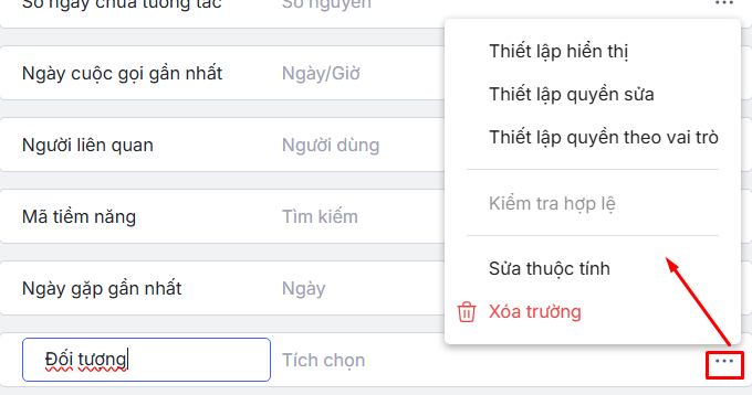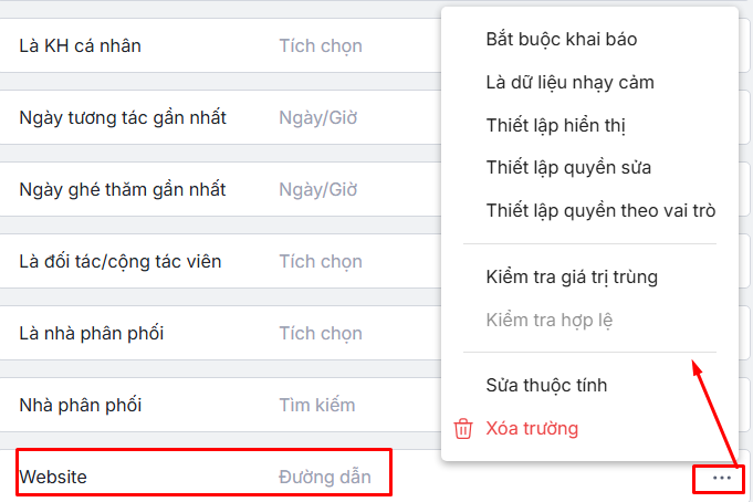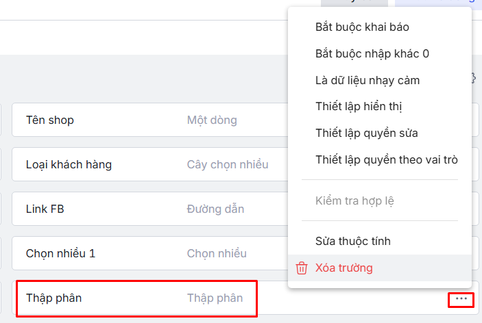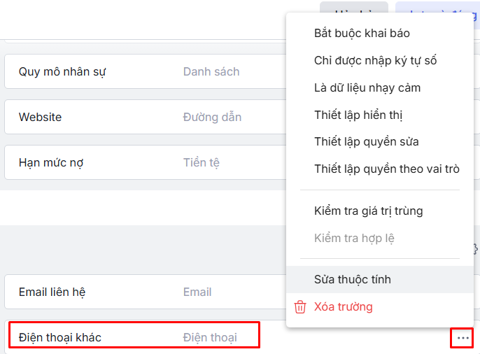 Lưu ý: Trường thông tin dạng Điện thoại hỗ trợ các chức năng gọi qua VoIP nhanh khi nhấn vào trường trên Danh sách, lựa chọn số điện thoại khi sử dụng chức năng Gọi điện trong chi tiết bản ghi/chào hàng.