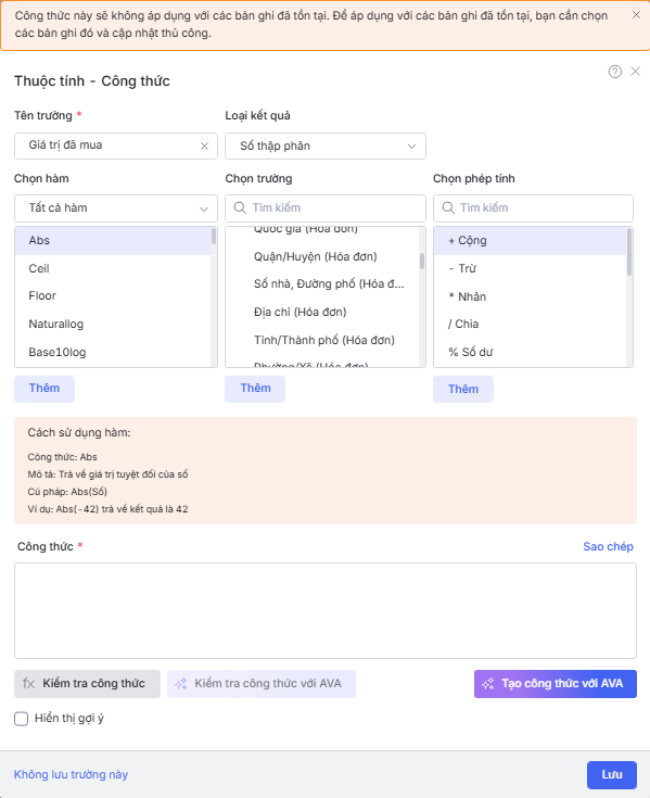 Ví dụ: Muốn tính công thức Số tiền còn phải thu = Tổng tiền – Đã thu (trong đó các giá trị Tổng tiền, Đã thu là các giá trị tuyệt đối) thì bạn thiết lập công thức Abs(${Tổng tiền}) – Abs(${Đã thu})