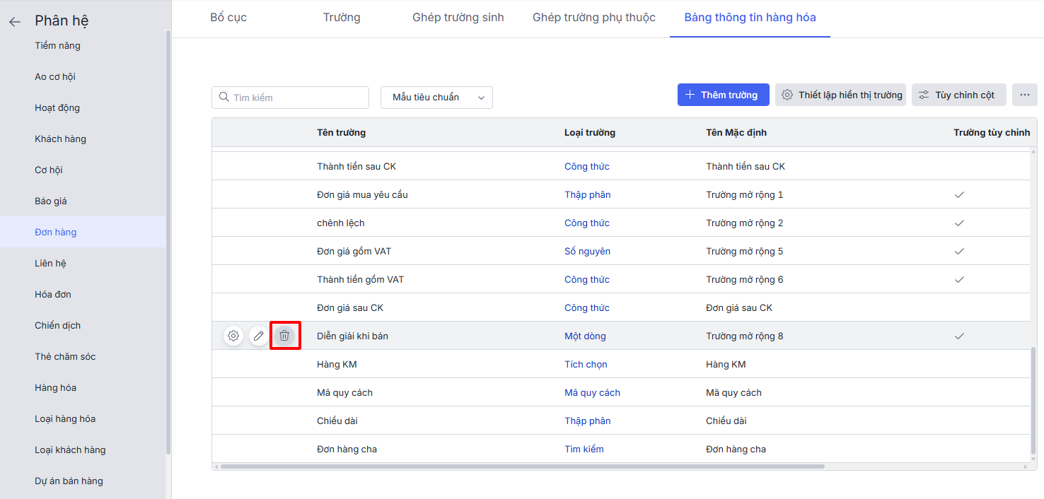 - Chỉ xóa được những trường mở rộng đã thiết lập trước đó