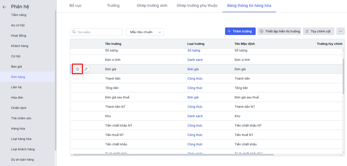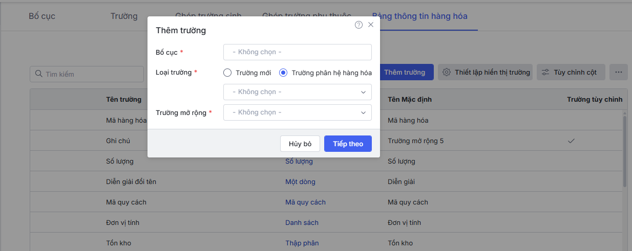 Bước 3: Tại tab Bảng thông tin hàng hóa, nhấn Thêm trường.