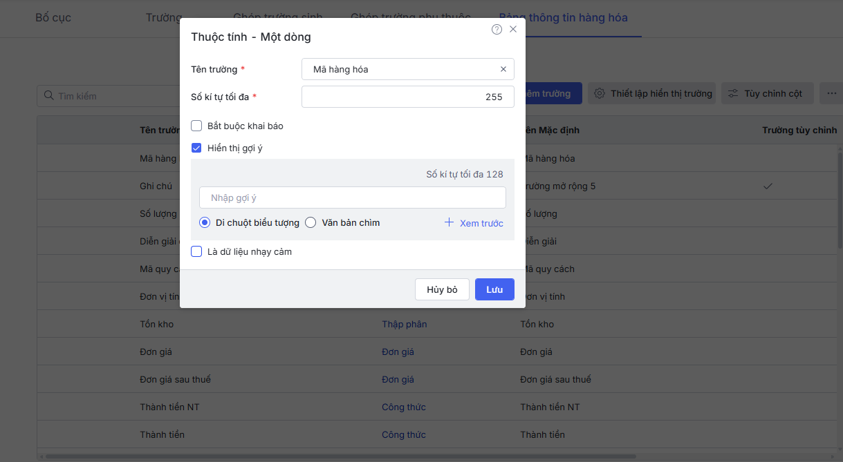 - Tích chọn Hiển thị gợi ý nếu muốn thiết lập gợi ý cho trường mới. Nhập gợi ý và chọn loại hiển thị của gợi ý: Di chuột biểu tượng/Văn bản chìm.