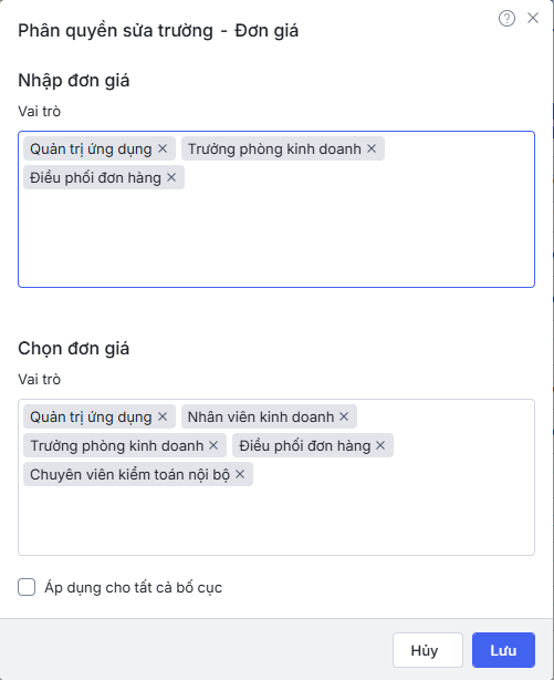 - Nếu muốn vai trò được sửa trường ở tất cả bố cục của phân hệ: Tích chọn Áp dụng cho tất cả bố cục.