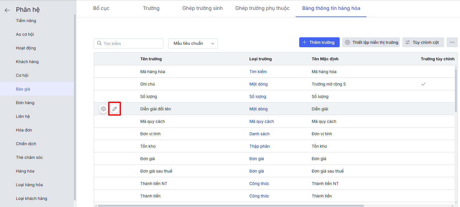 Bước 1: Tại tab Bảng thông tin hàng hóa, di chuột vào trường thông tin cần sửa và nhấn biểu tượng bánh răng