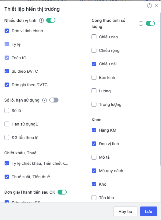 Để cập nhật công thức tính cho hàng hóa, xem chi tiết tại đây. Đơn giá/Thành tiền sau CKBật/Tắt lựa chọn Đơn giá/Thành tiền sau CK theo nhu cầu và tích chọn các thông tin muốn hiển thị trên bảng hàng hóa. Sau đó nhấn Lưu để hoàn thành.