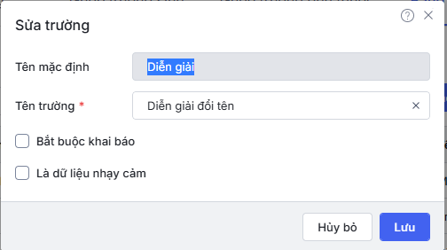- Việc xoá trường thông tin này, hệ thống sẽ xoá trường đó khỏi tất cả bố cục đồng thời xoá các dữ liệu đã phát sinh tại trường thông tin đó và không thể khôi phục lại được.