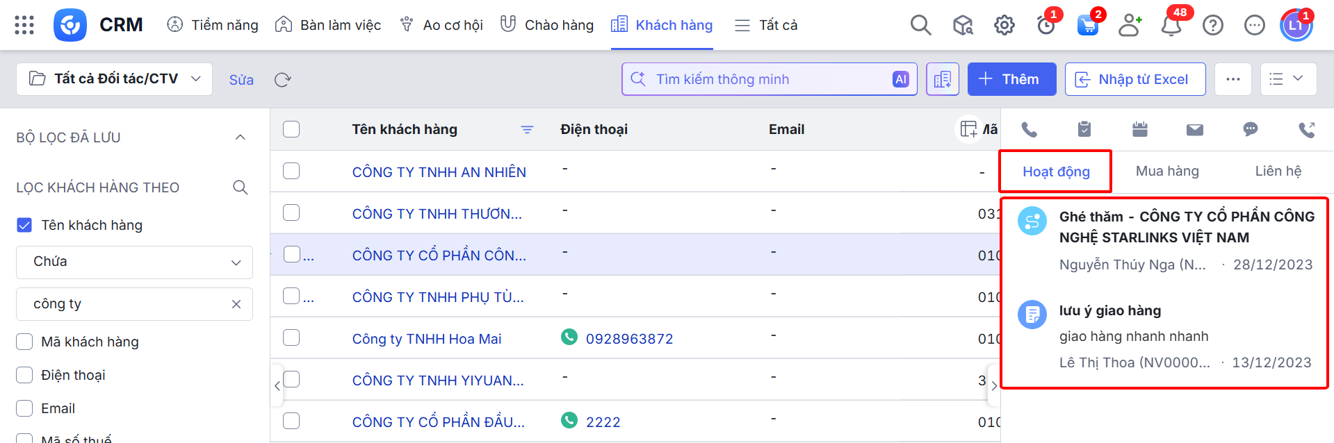 Bước 1: Phân hệ Khách hàng \ thanh bên phải Lịch sử giao dịch \ tab Hoạt động của \ xem chi tiết lịch sử giao dịch với khách hàng.
