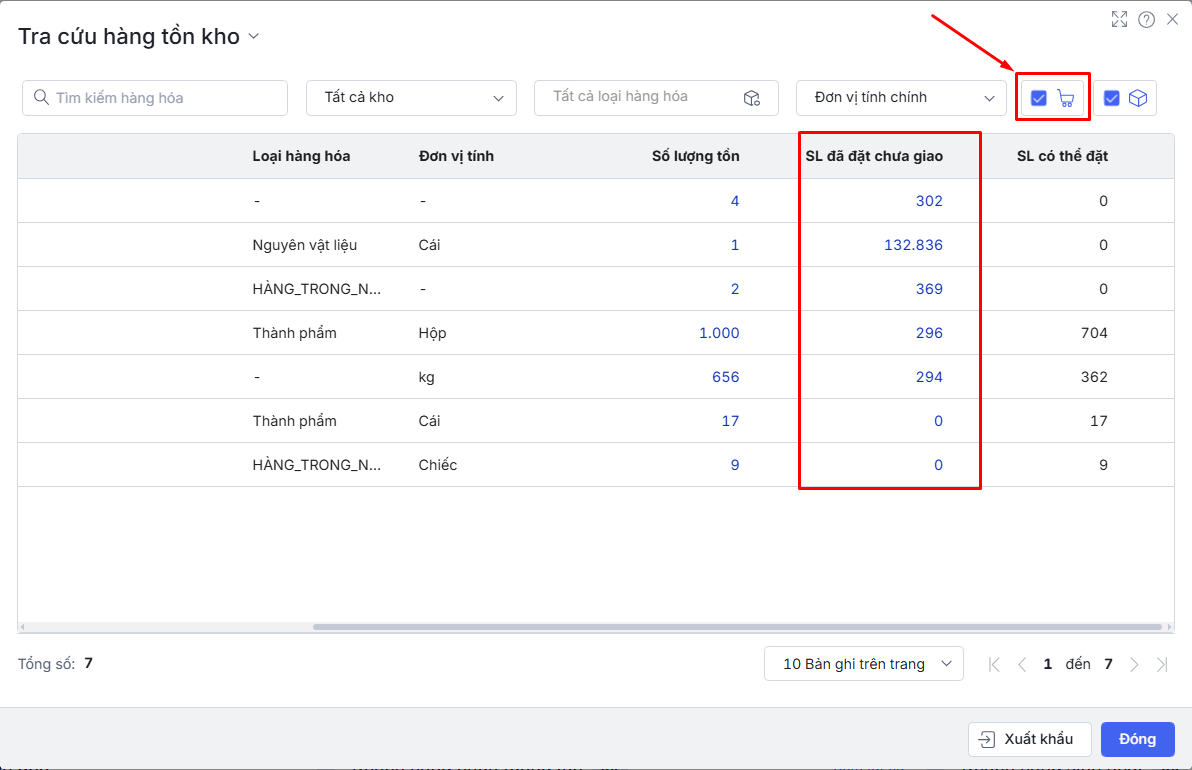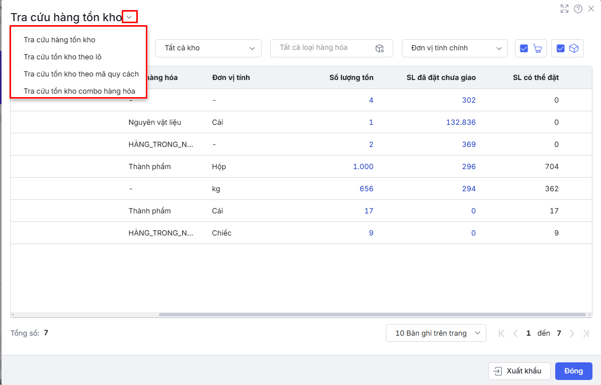 góc phải thanh công cụ để xem tồn kho.