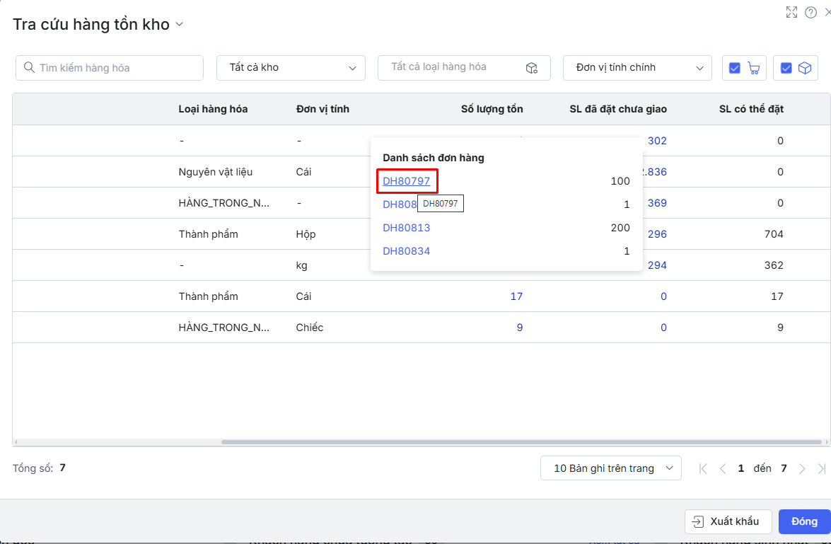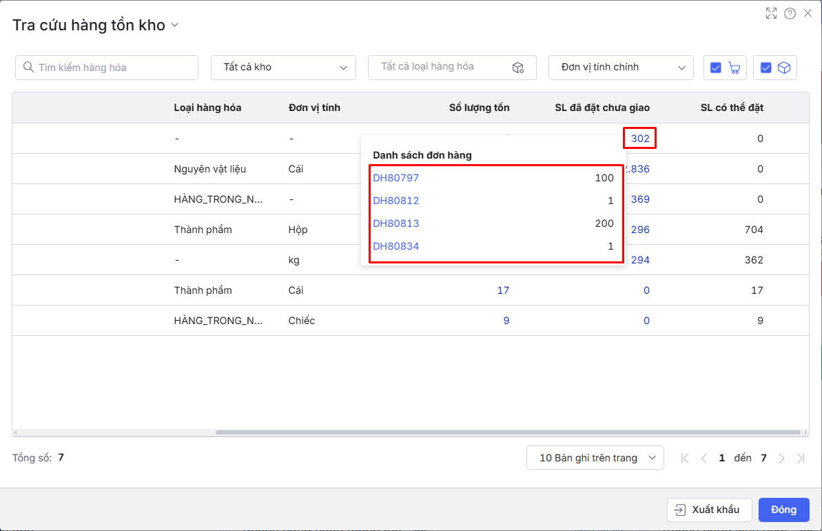 Bước 3: Ở cột SL đã đặt chưa giao\Nhấn chuột vào số lượng để xem danh sách Đơn hàng có hàng hóa đang xem đã được đặt chưa giao và số lượng hàng hóa của từng đơn hàng.