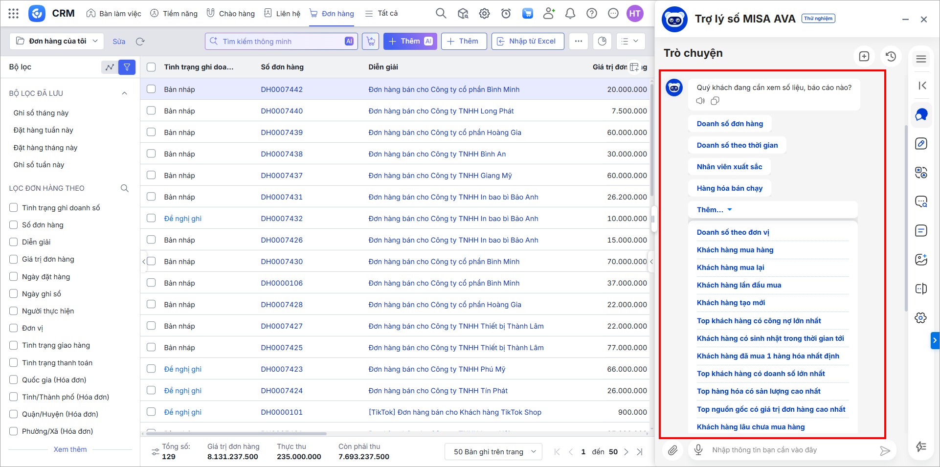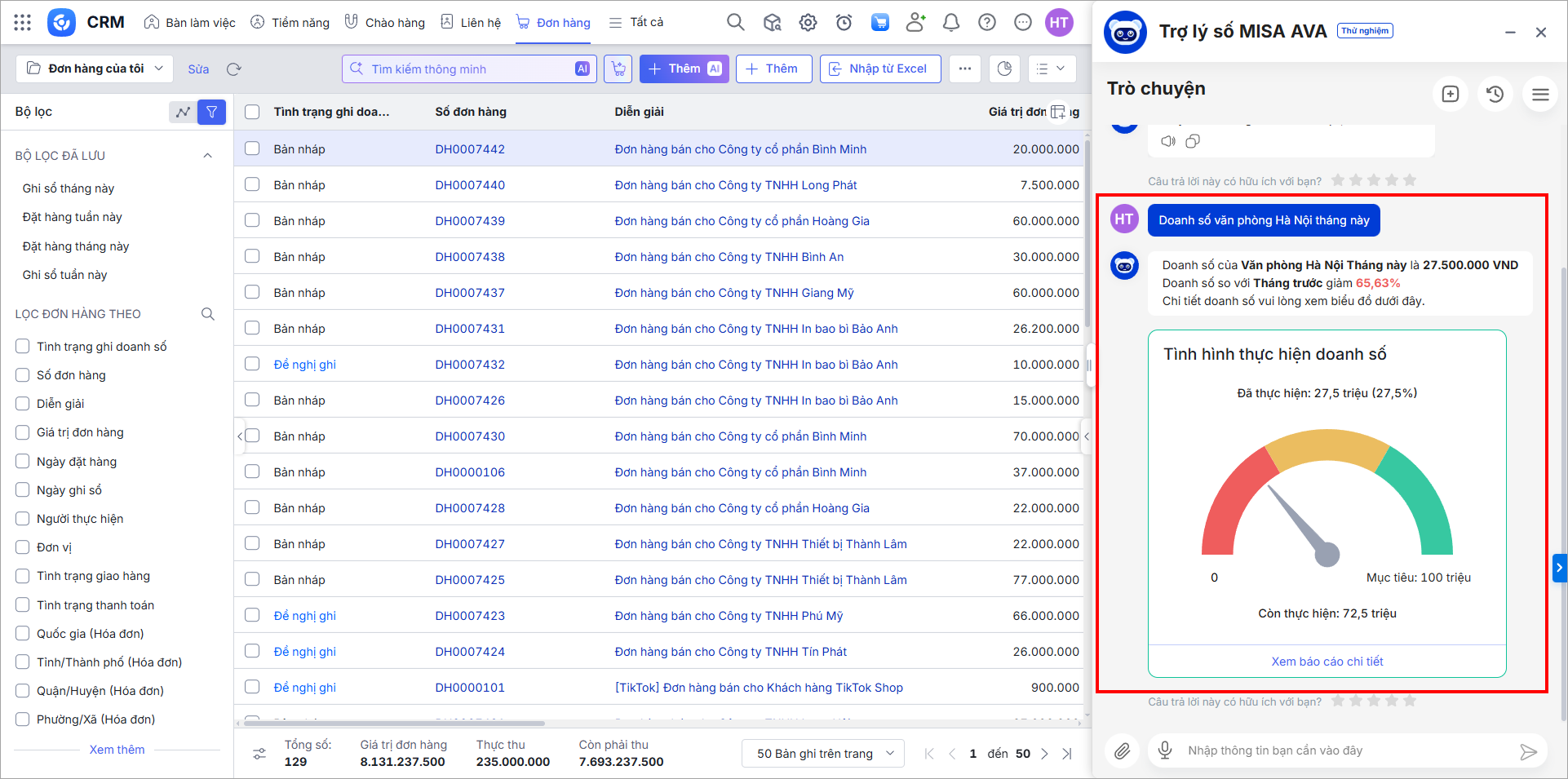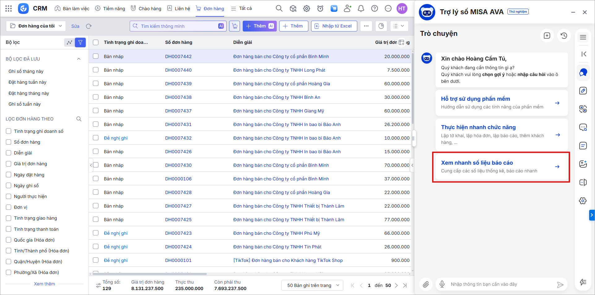 Bài viết hướng dẫn sử dụng trợ lý số MISA AVA để xem nhanh các báo cáo về doanh số, khách hàng.