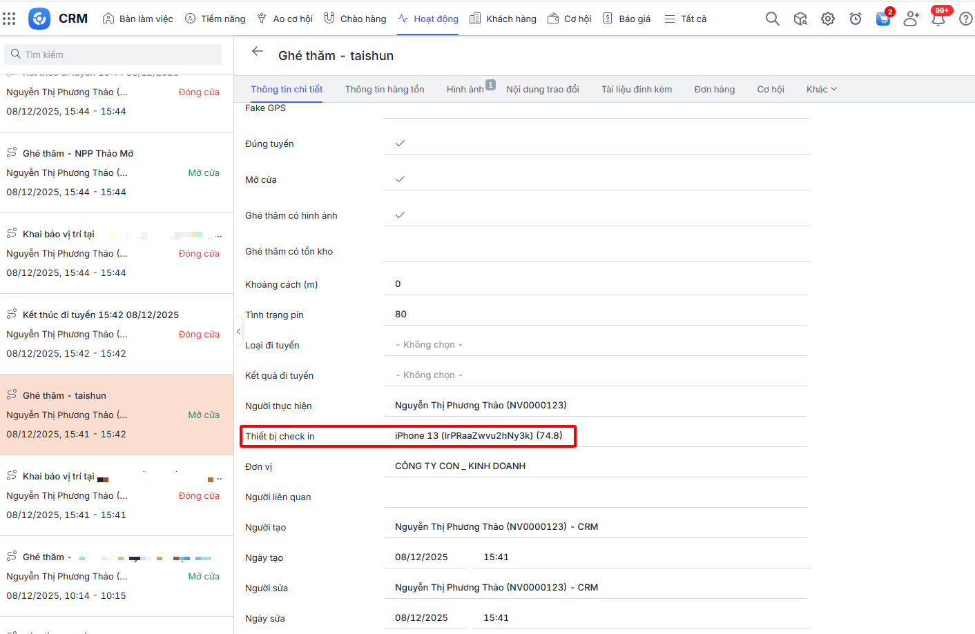 Ở hoạt động Đi tuyến hiển thị trường thông tin Thiết bị check in. Khi NVKD check in, hệ thống lấy lên thông tin thiết bị di động được sử dụng check in.