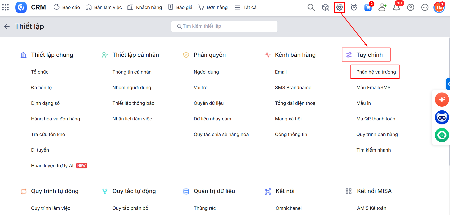 \ Tùy chỉnh\ Chọn Phân hệ và trường.
