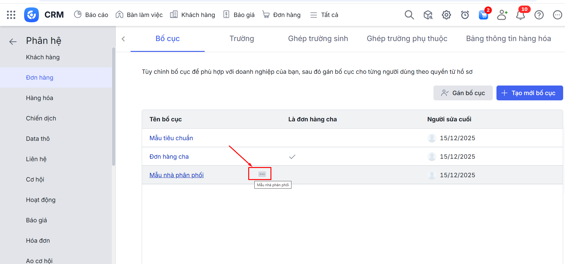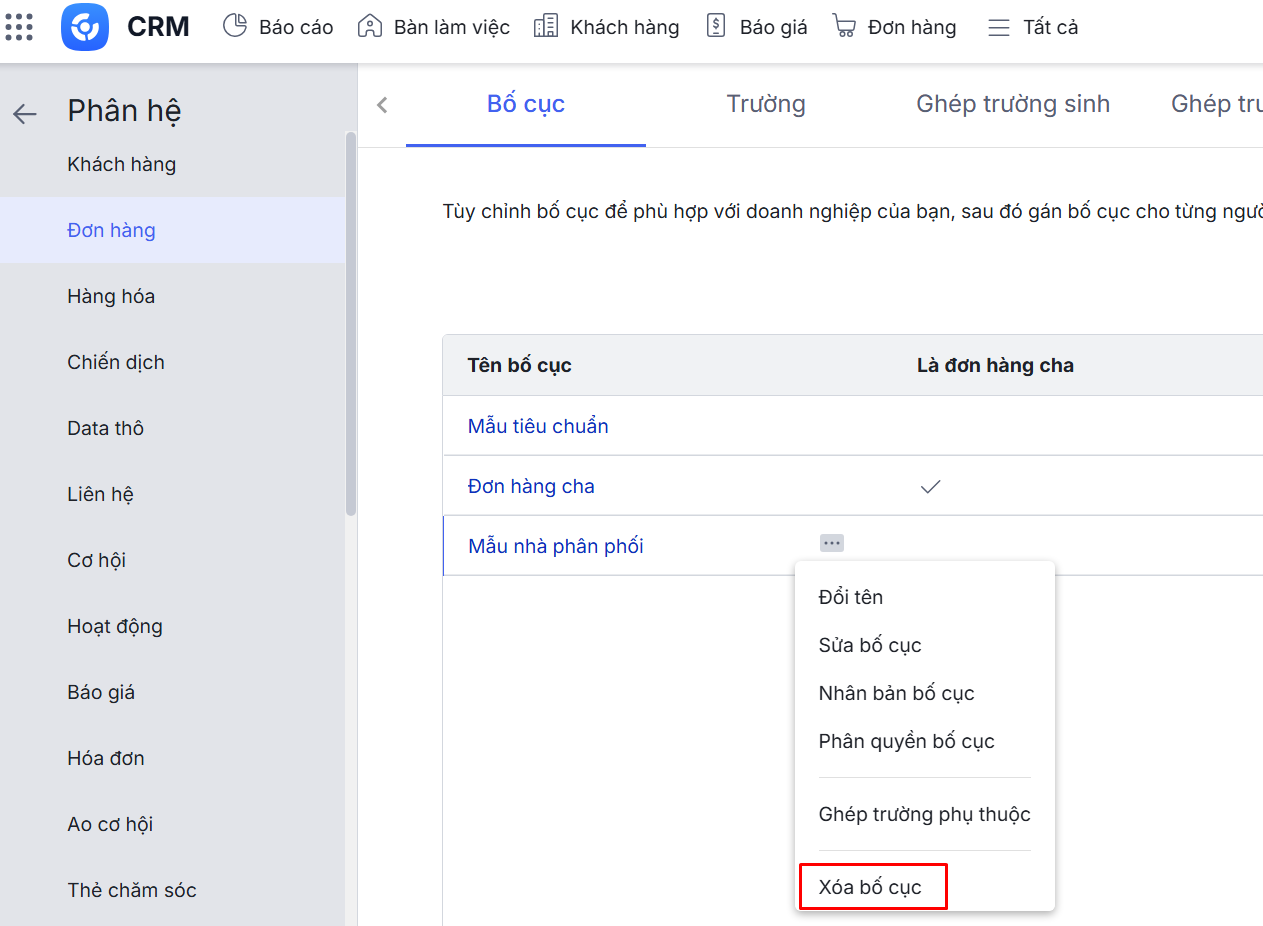 Lưu ý: Không được phép xóa các bố cục mặc định (gồm Mẫu tiêu chuẩn và Đơn hàng cha).
