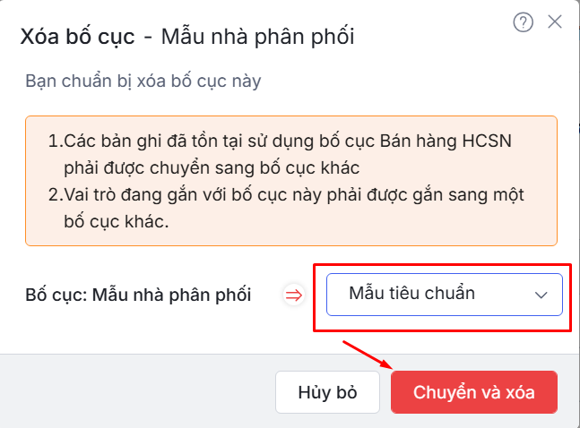 Bước 5: Nếu bố cục đã có phát sinh tạo Đơn hàng trước đó\ Chọn bố cục để chuyển các bản ghi đã phát sinh sang bố cục khác\ Nhấn Chuyển và xóa để hoàn thành.